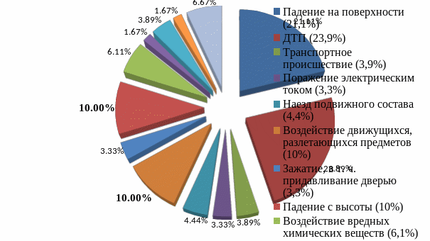 Таким образом, основными видами происшествий, в результате которых произошло травмирование, явились: падение на поверхности, ДТП, падение с высоты, воздействие перемещающихся (разлетающихся) предметов, воздействие вредных химических веществ, наезд подвижного состава, хулиганские действия посторонних лиц. На эти происшествия приходится 83,3% от общего производственного травматизма (таблица 6.1, рисунок 6.1.).