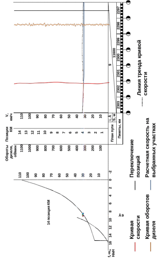 Проанализировав профили, кривые скоростей и графики оборотов коленчатого вала дизеля был выбран участок, на котором не действуют введенные ранее ограничения – участок ветки Байкало-Амурской магистрали Тында-Хани (2297-2303 километры) (рисунок 3.5). На данном участке соблюдается устоявшийся режим ведения поезда – скорость движения состава выше зоны ограничения по сцеплению; на протяжении всего подъема машинист тепловоза выдерживает 14 позицию контроллера машиниста, коленчатый вал дизеля вращается с частотой