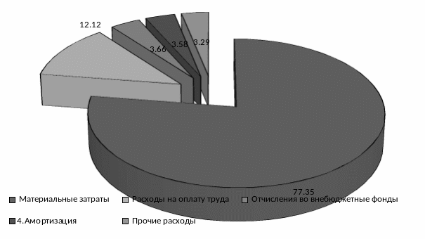 Наибольший удельный вес в структуре себестоимости продукции занимают материальные затраты: в 2014 г. 77,35 %, в 2013 г. -76,99 % и в 2012 г. – 75,4, то есть имеет место явная тенденция к росту.