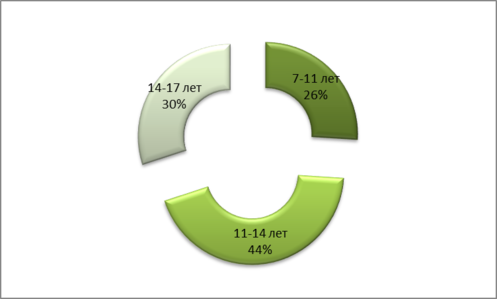 У большей части опрошенных (44 %), дети в возрасте 11 – 14 лет, у следующей группы опрошенных дети в возрасте 14 – 17 лет (30 %), у третьей группы возраст детей составляет 7-11 лет (26 %) рис. 2.6.