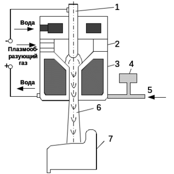 Рисунок 4.4 – Принципиальная схема плазменного упрочнителя (плазмотрона): 1 – вольфрамовый катод; 2 – изоляционная прокладка; 3 – сопло (анод); 4 – дозатор; 5 –транспортирующий газ; 6 – плазменная струя; 7 – бандаж.
