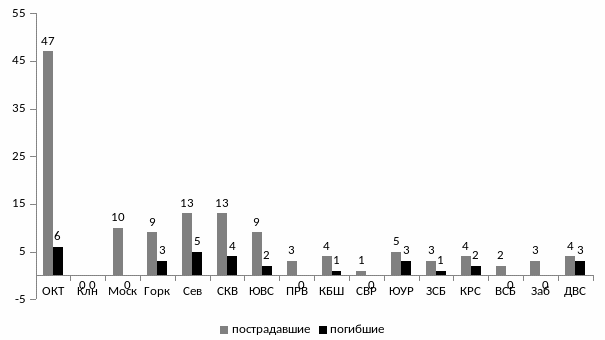 Наибольшее количество людей пострадало во время ДТП на Октябрьской (пострадали 47 человек, их них 6 человек погибли), Московской (10 человек, погибших нет), Горьковской (9 человек, из них 3 человека погибли), Северной (13 человек, из них 5 человек погибли), Северо-Кавказской (13 человек, из них 4 человека погибли), Юго-Восточной (9 человек, из них 2 человека погибли), Приволжской (3 человека, погибших нет), Куйбышевской (4 человека, из них 1 человек погиб), Южно-Уральской (5 человек, из них 3 человека погибли), Западно-Сибирской (3 человека, из них 1 погиб), Восточно-Сибирской (2 человека, погибших нет), Дальневосточной (4 человека, из них 3 человека погибли) и Забайкальской (3 человека, погибших нет) железных дорогах (рисунок 1.2.)