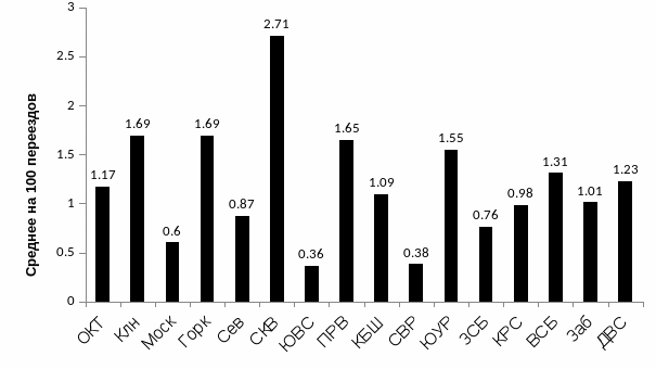 По количеству дорожно-транспортных происшествий в 1-м полугодие 2015 года на 100 переездов (при среднесетевом показателе в 1,15), наибольшее количество происшествий произошло на Октябрьской, Восточно-Сибирской, Калининградской, Горьковской, Северо-Кавказской, Забайкальской, Южно-Уральской, Дальневосточной и Приволжской железных дорогах, подробные данные представлены на рисунке 1.1.