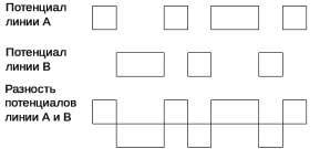 Метод передачи, при котором по одному проводу пересылается нормальный сигнал, а по другому - инвертированный, называется балансированной передачей. Суть его заключается в передаче одного сигнала по двум проводам. Причем по одному проводу (условно A) идет оригинальный сигнал, а по другому (условно B) - его инверсная копия. Другими словами, если на одном проводе «1», то на другом «0» и наоборот. Таким образом, между двумя проводами витой пары всегда есть разность потенциалов: при «1» она положительна, при «0» - отрицательна. При такой передаче любое внешнее воздействие на кабель (электромагнитное и т.п.) будет в одинаковой мере влиять на оба провода, а, следовательно, будет игнорироваться принимающим устройством. Форма сигналов передаваемых в линии связи представлена на рисунке 2.5.