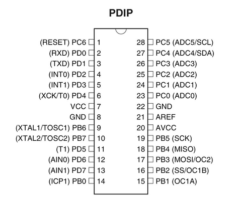 | PC6/RESET | Вывод сброса контроллера. Низкий уровень на этом выводе длящийся дольше чем минимальная длительность импульса генерирует сброс |
