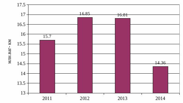По данным результатам можно сказать, что реформа железнодорожного транспорта в части пригородного сообщения, не была доведена до логического конца. Негативные результаты реформы ярко отражает тот факт, что под влиянием совокупности нерешённых организационных проблем за последние года объёмы вагоно-километровой работы в пригородном сообщении, например, по данным Дальневосточной железной дороги снизились практически на 10%, с 14,361 млн. ваг-км в 2014 г. до 12,958 млн. ваг-км в 2015 г., рисунок 1.1.