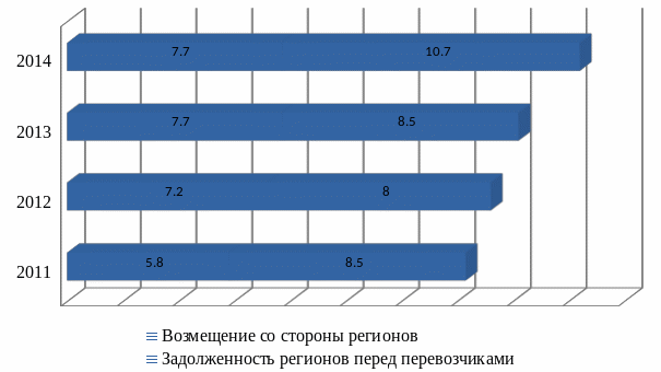 Региональный источник финансирования представлен в виде компенсации убытков перевозчиков субъектами РФ, возникающие в ходе регулирования тарифа согласно договорам на оказание услуг по перевозке. В договоре субъект РФ устанавливает стоимость проезда ниже экономически обоснованного уровня тарифа и обязуется возместить перевозчикам убытки[23]. Однако доля реального возмещения со стороны регионов ежегодно составляет менее половины от требуемого объема компенсации (от 40 до 48%), рисунок 1.4.