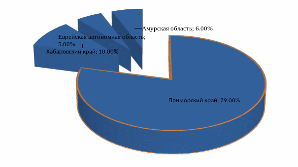 В общей структуре пассажирских перевозок наибольшая доля перевозок приходится на Приморский край, рисунок 2.1. Это связано с большим пассажиропотоком Владивостокской агломерации.