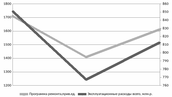 Наибольший удельный вес в струтуре расходов занимают расходы на материальные затраты, которые в I полугодии 2015 года снизились на 18,9 % по сравнению с предыдущим полугодием. Однако во втором полугодии 2015 года они вновь увеличились, прирост составил 15,87 %. Такая динамика обусловлена изменением программы ремонта в первом полугодии 2015 года произошло снижение программы ремонта, а во втором полугодии произошел рост программы. Зависимость эксплуатационных расходов от программы ремонта можно пронаблюдать на рисунке, представленном ниже.