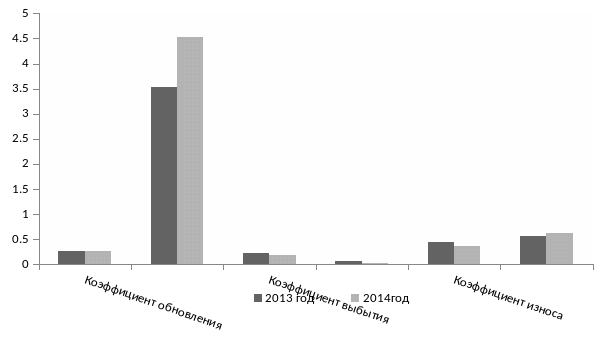Сравнивая коэффициенты годности и износа можно увидеть положительную динамику. Показатель износа был снижен на 0,0714,а показатель годности увеличен на 0,0714,Разница между этими коэффициентами в сравнении 2013 года с 2014 годом равна 0,0728. Это говорит, что состояние основных фондов улучшилось. Изменения наглядно показаны на (рис.7) График изменения движения и технического состояния основных средств.