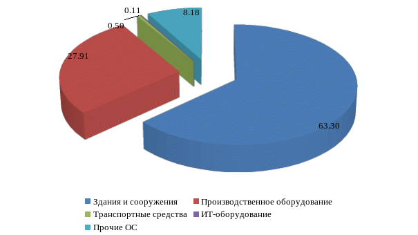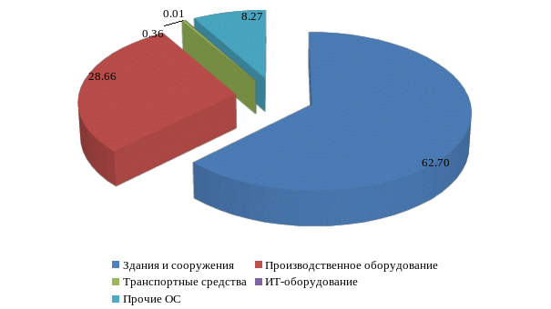 Рассмотрим структуру основных средств, которая позволит определить долю активной части основных фондов, таких как здания и сооружения, производственное оборудование.
