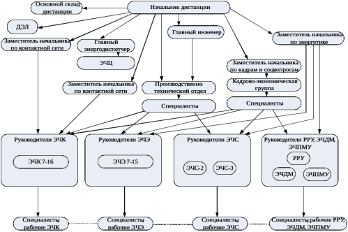 В непосредственном подчинении начальника Дистанции находятся главный инженер, два заместителя по контактной сети, заместитель по энергетике, заместитель по кадрам и социальным вопросам, начальник производственно-технического отдела.