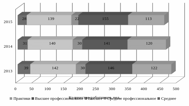 Из данных таблицы 2.9 и диаграммы на рисунке 2.9. видно, что в рассматриваемом периоде удельные доли персонала остаются практически неизменными. Подавляющая часть контингента имеет высшее профессиональное (30,13-33,92 %) и среднее профессиональное образование (29,65-30,42 %). Большая доля персонала (24,73-26,92 %) является практиками – то есть имеют общее среднее образование и необходимые профессиональные навыки приобретают непосредственно на производстве.