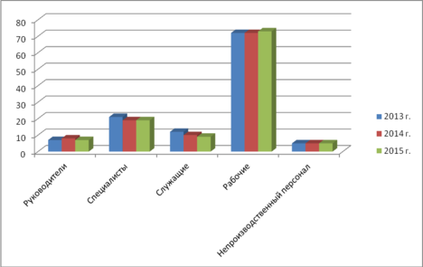 При этом численность руководителей в 2015 году по сравнению с 2013 годом не изменилась и составляла от 6 до 6,2 % в общем составе персонала предприятия, при том, что был рост руководящего состава на 1 человека в 2014 году произошел за счет введения новой должности заместителя главного инженера и сокращения в 2015 году должности начальника отдела кадров, что практически не изменило численность руководства в общем составе персонала предприятия (рисунок 3.8).