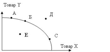 Если обратиться к границе производственных возможностей, представленных на рисунке 1.2, то мы видим, что при максимально эффективной деятельности, точки А, Б, С, которые отражают возможные варианты производства, должны лежать на поверхности одной кривой, то есть на пределе производственных возможностей. Но если, одна из точек отклоняется вправо, от указанной ранее кривой (точка Д), это означает, что превышены производственные возможности страны, то есть производство благ в таких объемах невозможно. Если точка отклоняется влево (точка Е) — предприятие неэффективно либо неполно использует производственные возможности.