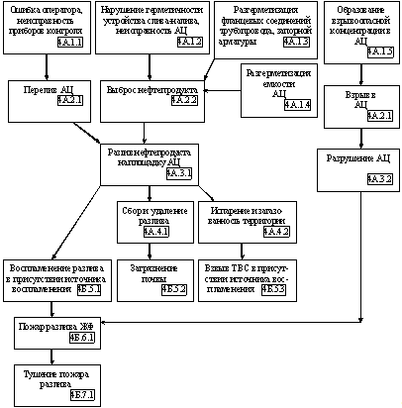 А1 – 01: Нарушение герметичности линии нагнетания → разлив бензина на пол в насосной → загазованность насосной, прилегающей территории → воспламенение и взрыв ТВС в присутствии источника зажигания → пожар насосной;