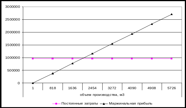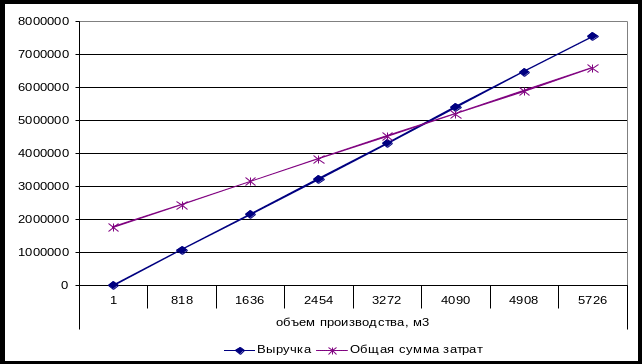 Построим график достижения точки безубыточности, основываясь при этом на ежемесячном объеме производства (818 м3 стенового камня)