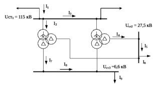 Расчет максимальных рабочих токов основных присоединений подстанции производится на основании номинальных параметров оборудования. Методика выбора и расчета представлена в [2]. Схема для расчета максимальных рабочих токов основных присоединений подстанции представлена на рисунке 2.6. Максималные рабочие токи некоторых присоединений тяговой подстанции представлены в качестве исходных данных в приложении А в таблице А.1. Произведем расчет максимальных рабочих токов для остальных присоединений тяговой подстанции «Первая речка».