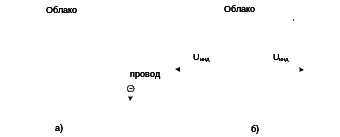 Грозовое облако над линией электропередачи имеет отрицательный заряд. Заряд такого же знака несет и лидер этого облака. Заряды лидера и облака индуктируют на проводе линии положительные заряды (Рисунок 4.1,а). отрицательные заряды провода оказываются свободными и через проводимость линейной изоляции стекают в землю. Во время главного разряда отрицательные заряды лидера и облака нейтрализуются, поэтому связанные положительные заряды освобождаются и , растекаясь в обе стороны по проводу, создают электрическую составляющую индуктированного перенапряжения (Рисунок 4.1,б).