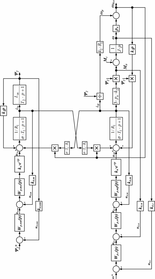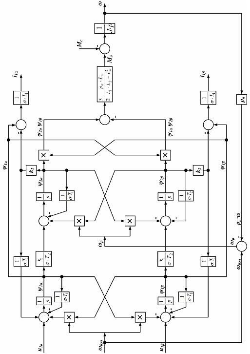 Схема построена с использованием математического описания ненасыщенного асинхронного двигателя во вращающейся системе координат. Преобразователь характеризуется коэффициентом передачи по напряжению и чистым запаздыванием на время τ, равное периоду ШИМ инвертора. Считается, что токи i1A, i1B, i1С, а следовательно, и i1α и i1β, измеряются безынерционными датчиками тока с некоторым коэффициентом kд.т. Датчик скорости имеет коэффициент передачи kд.сНа рисунке Г1 приведена структурная схема асинхронного двигателя при произвольном повороте вращающейся системы координат относительно пространственных векторов. Данная структурная схема используется в системе рисунка Г2 в качестве промежуточной подсистемы (блока) с входными величинами u1α, u1β, ω0эл, Мс и выходными параметрами i1α, i1β, ω.[11]