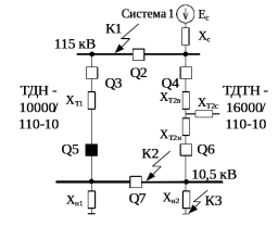 Расчеты по нахождению токов КЗ будем производить в именованных единицах (с сохранением трансформаторных связей).