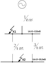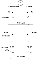 Согласно [6], выбор и проверка электрических аппаратов и токоведущих элементов по электродинамической и термической устойчивости производится по току трехфазного короткого замыкания Ik(3) , поэтому в проекте необходимо произвести расчет токов короткого замыкания Ik(3) для всех РУ и однофазного замыкания на землю Ik(3) для РУ питающего напряжения. Для чего на основании принятой схемы главных электрических соединений подстанции составляется структурная и расчётная схема (рисунок 4.1), а по ней схема замещения (рисунок 4.2) проектируемой подстанции.