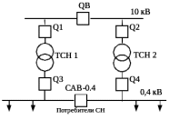Потребители собственных нужд подстанции питаются от сети 0,4 кВ, которая получает питание от двух понижающих трансформаторов (ТСН). Присоединение трансформаторов собственных нужд к сети зависит от системы оперативного тока. На данной подстанции ТСН присоединятся к шинам ЗРУ-10 кВ. На рисунке 7.1 приведена схема системы электроснабжения собственных нужд рассматриваемой подстанции.