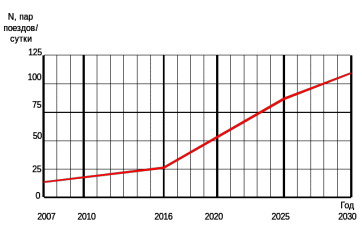 Пропускные способности указаны на рисунке 1.1. Текущее количество пар поездов, пропускаемое в сутки, равно 26. В год в среднем оно должно расти на 7 пар.