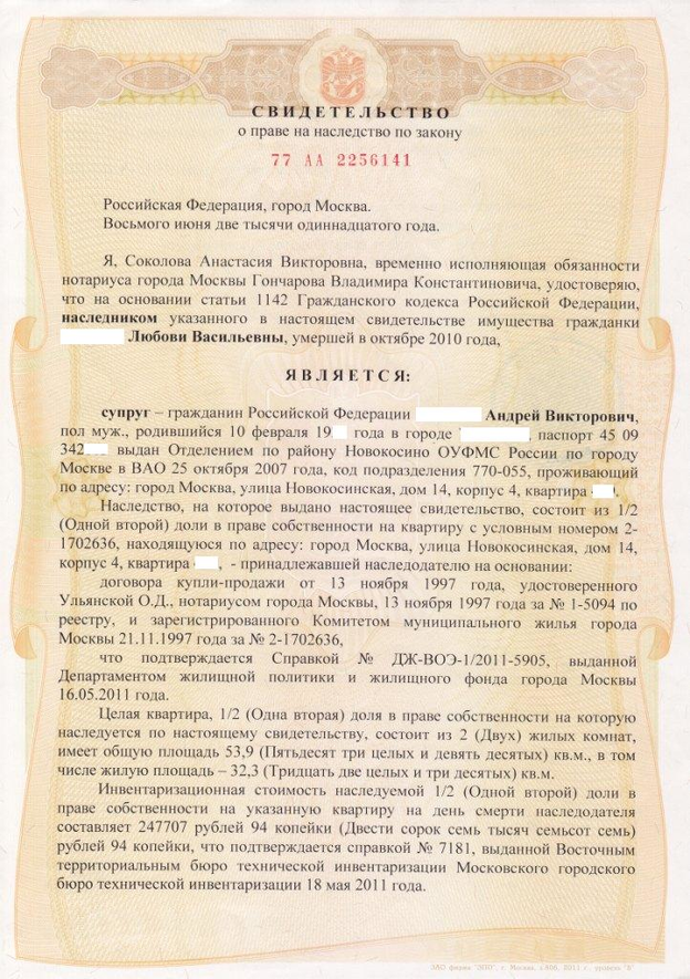 Образец свидетельства о праве на наследство по закону