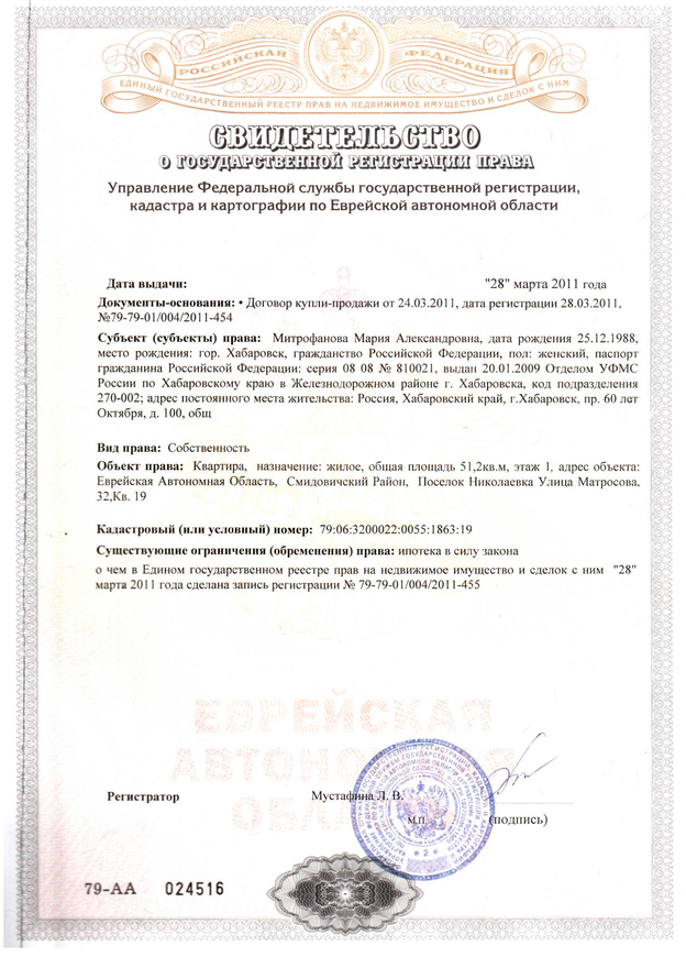 Образец свидетельства о праве собственности