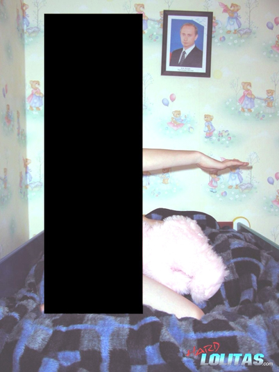 Фотоснимок несовершеннолетней порномодели. На заднем фоне отобразились элементы обстановки (обои, портрет, игрушка, одеяло), позволяющие предположить, что съемка велась в детском учреждении типа интернат.