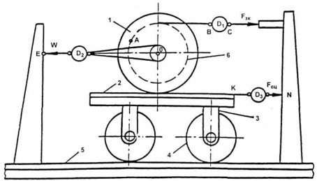 , измеряемой динамометром Д1 тележка 3 стремится откатиться в сторону, противоположную движению. При этом образуется сила сцепления