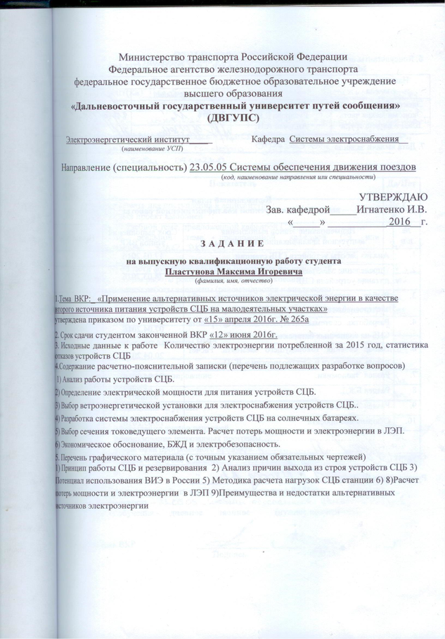 Целью дипломной работы было применение альтернативного источника энергии в качестве второго источника питания устройств СЦБ.
