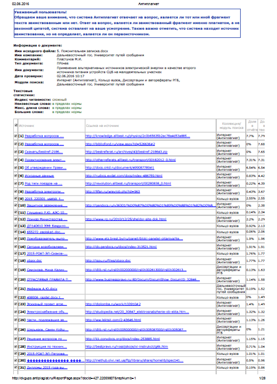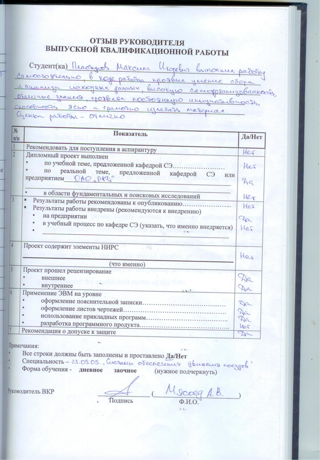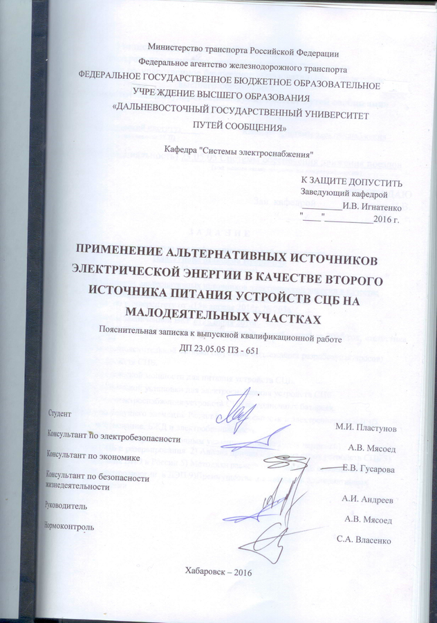 Анализ результатов расчета позволил сделать вывод о количестве электроэнергии потребляемой устройствами СЦБ. Было рассчитано количество электроэнергии, которое способны выработать ветроэнергетические установки, солнечные батареи в определенных климатических условиях, был произведен расчет энергетических показателей. В соответствии с полученными данными было определено количество ветрогенераторов и фотоэлектрических панелей, необходимых для бесперебойного питания устройств СЦБ. В дипломной работе были рассчитаны экономические показатели для каждого представленного варианта. Срок окупаемости альтернативного источника электроэнергии на базе ветрогенератора Сокол-1 составил 4,9 лет, на базе ветрогенератора Канюк-2 – 5,6 лет. Для источника электроэнергии на базе солнечных панелей ФСМ-250 годовые текущие расходы на содержание и ремонт батарей превысили годовые текущие расходы на электроэнергию и составили 35,26 лет.