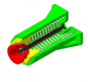 Рассмотрим поглощающий аппарат РТ-120, фрикционный узел в аппарате подпирается комплектом упругих элементов. Особенностью фрикционного узла, в отличие от других аппаратов шестигранного типа (таких как Ш-2В), является наличие на внутренних поверхностях корпуса в зоне работы клиньев бронзовых вставок. Они стабилизируют трение и позволяют снизить износы трущихся деталей. Кроме того, аппарат не имеет стяжного болта. Направляющий стержень служит для центрального сжатия упругого комплекта. В качестве упругого узла в поглощающем аппарате РТ-120 применен комплект из полимерных элементов, поджатых с помощью шайбы, трех фрикционных клиньев и нажимного конуса. На корпусе в зоне контакта с клиньями расположены Н-образные канавки. В них запрессованы бронзовые вкладыши, снижающие интенсивность износа поверхностей корпуса и клиньев [6]. Внешний вид представим на рисунке 2.9.