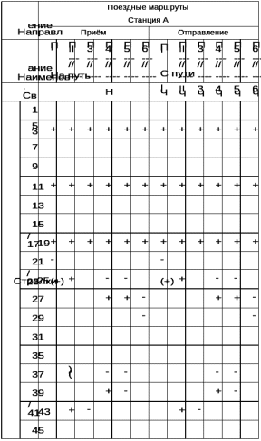 Основной поездной маршрут – маршрут, имеющий наименьшую длину, допускающий наибольшую скорость и имеющий наименьшее количество враждебных маршрутов. Основные поездные маршруты нечетной горловины представлены в виде таблицы 1.1. В таблице последовательно перечислены все маршруты приема, оправления. Также в таблице указаны положения стрелок, участвующих в маршруте, и охранных. Нормальное положение стрелок обозначено знаком «+», переведенное положение знаком «-». Стрелки, не участвующие в маршруте, но переводимые в охранное положение, обозначаются знаком «(+)» или «(-)».