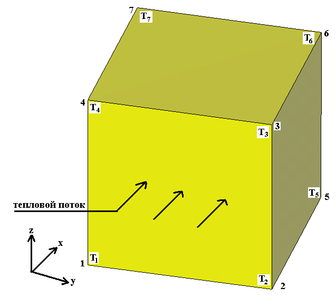 Возможен учет количества теплового потока в любом направлении. Это количество может быть вычислено по значениям узловых температур и коэффициентов глобального уравнения конечного элемента. Пример вычисления теплового потока по оси Х для гексаэдра показан на рис. 3.3.
