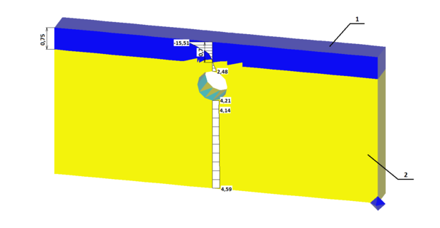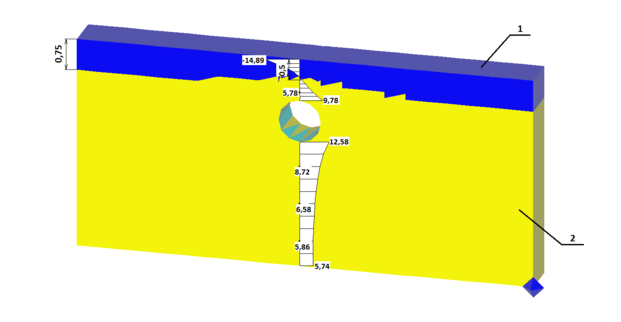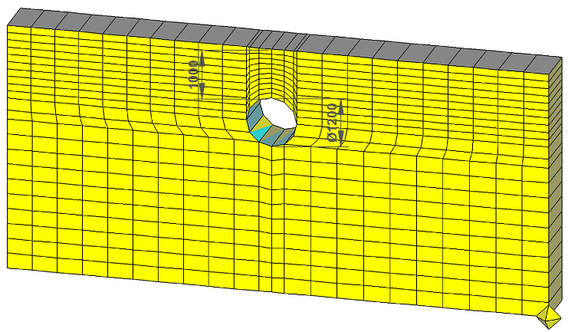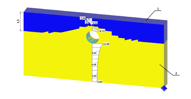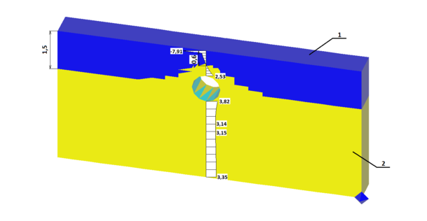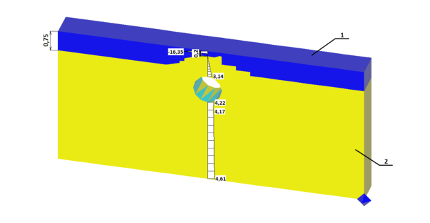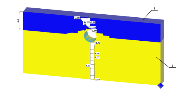 В качестве исходных данных примем климатические и гидрогеологические характеристики г. Хабаровска. Внешний диаметр данного участка нефтепровода составляет 1020 мм, проложен нефтепровод траншейным способом без применения инженерной защиты и имеет заводскую изоляцию, теплоизоляционными свойствами которой можно пренебречь. Температура перекачиваемой нефти минимальная – плюс 4,3ᵒС и максимальная – плюс 17,2ᵒС. Нормативная глубина заложения магистрального нефтепровода 1м. Расчётная схема в ПО FEM Models (модуль «Termoground») представлена на рисунке 3.4.