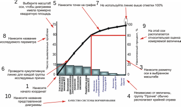 Диаграмма Парето будет наиболее эффективной, если число факторов, размещаемых по оси абсцисс, составляет от 7 до 10.
