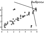 При анализе диаграммы разброса выясняют есть ли на ней выбросы (рисунок 1а). Затем исследуют причины появления выбросов (ошибка измерения или записи данных, изменения в условиях работы, другие особые причины) и исключают их из дальнейшего корреляционного анализа.