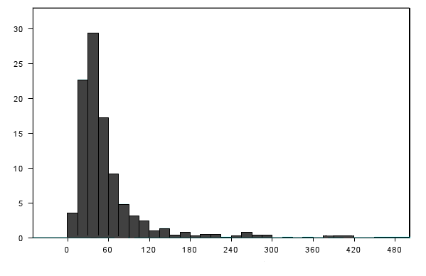 Рисунок 1.4 – Гистограмма задержек отправления поездов (сек.)