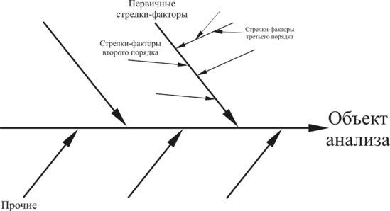 - изобразите факторы, влияющие на объект анализа, следующим образом: к основной горизонтальной линии подведите первичные стрелки-факторы, к которым, в свою очередь подводят стрелки-факторы второго порядка (влияющие на первичные) и т. д. до тех пор, пока все выявленные факторы не будут включены в диаграмму;