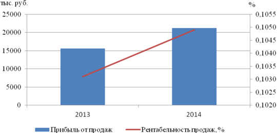 Рисунок 2.5 – Прибыль от реализации и рентабельность продаж 2013-2014 гг.