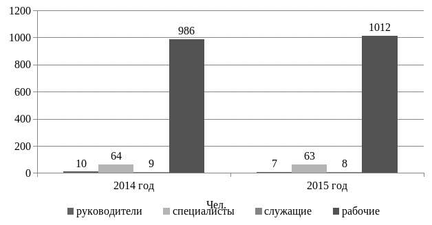 Из таблицы 2.20 видно, что в 2015 году численность работников по отношению к 2014 году увеличилась на 23 человека или на 2,2 %: за счет увеличения количества рабочих на 26 человек (на 2,6 %) и снижения численности руководителей на 3 человека или 30,0 %, специалистов и служащих на 1 человека или 1,6 и 11,1 % соответственно. По сравнению с планом общая численность увеличилась на 8 человек или 0,7 %. Доля руководителей снизилась на 22,2 %, удельный вес специалистов возрос на 4 человека или 6,8 %.