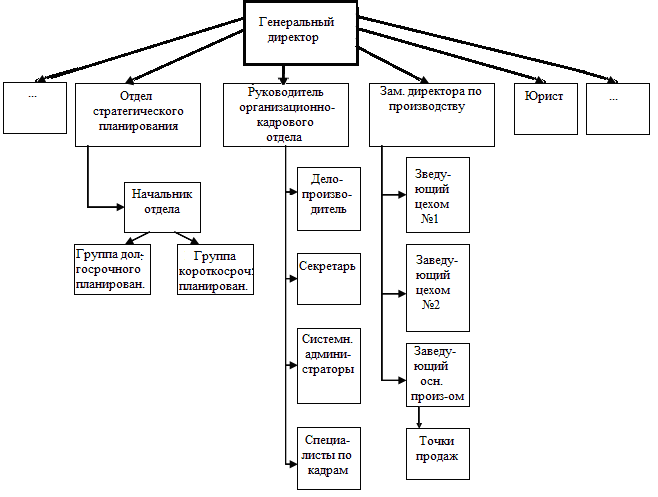 В прямом подчинении у генерального директора находятся семь должностей: главный инженер, зам. директора по производству, руководитель коммерческого отдела, руководитель организационно-кадрового отдела, зам. директора по финансовым вопросам, главный технолог, зам директора по снабжению. Причем начальник лаборатории одновременно подчиняется и генеральному директору, и заместителю по производству.