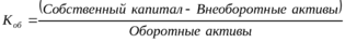 Смысл данного коэффициента заключается в следующем. Сначала, в числителе формулы вычитают из собственного капитала внеоборотные активы. Считается, что самые низколиквидные (внеоборотные) активы должны финансировать за счет самых устойчивых источников - собственного капитала. Более того, должна остаться еще некоторая часть собственного капитала для финансирования текущей деятельности.