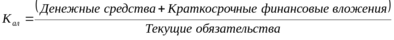 Коэффициент быстрой ликвидности (иногда называют промежуточной или срочной ликвидности) – финансовый коэффициент, равный отношению высоколиквидных текущих активов к краткосрочным обязательствам (текущим пассивам) (формула 4.5). Источником данных служит бухгалтерский баланс компании аналогично, как для текущей ликвидности, но в составе активов не учитываются материально-производственные запасы, так как при их вынужденной реализации убытки будут максимальными среди всех оборотных средств. Коэффициент отражает способность компании погашать свои текущие обязательства в случае возникновения сложностей с реализацией продукции.