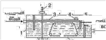 ), то нефтепродукты скапливаются на поверхности воды, по данной закономерности и работают нефтеловушки [32]. На рисунке 2.6 приведены следующие обозначения: 1 – корпус, 2 – гидроэлеватор, 3 – скопившиеся нефтепродукты, 4 – сборная трубка, 5 – отделяющая часть, 6 – скребковый транспортер.