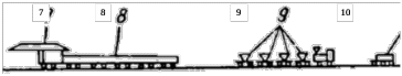 Укладка пути осуществляется с помощью путеукладочного состава, который состоит из путеукладочного крана, платформ с путевыми звеньями, хоппер-дозаторов со щебнем, подбивочных машин. На рисунке 2.5 приведены следующие обозначения: 7 – путеукладочный кран, 8 – платформа с путевыми звеньями, 9 – хоппер-дозаторы со щебнем, 10 – подбивочные машины [5].