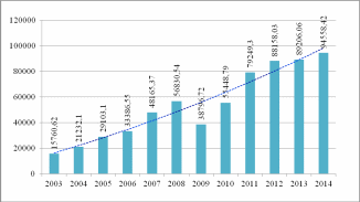 Рисунок 2.1 Динамика российско-китайского товарооборота с 2003 по 2014гг., (млрд. долл.)[22]